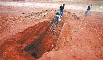 從山坡上可以看到出土漢代耳珰的平臺已經被挖空了一大塊。據唐濤介紹:“6月初他們剛剛開工不久,我們(郴州市文物管理處)6月4日就在這塊被挖空的平臺發(fā)現了一座漢代磚室墓,當時下達了‘停工通知書’,告知建設方,需經我們對墓葬發(fā)掘后才能再動工!钡且患埼臅缡链蠛#恢菔形奈锕芾硖帥]有接到建設方的任何回復。