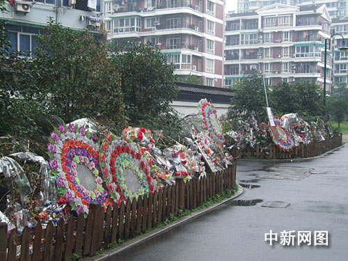 11月5日,記者看到,杭州新星實(shí)業(yè)有限公司前面近300平方米的空地仍舊被圍墻圍著,圍墻外面則擺滿了花圈,而這道圍墻,就是小區(qū)居民與陳連榮之間的導(dǎo)火索。
