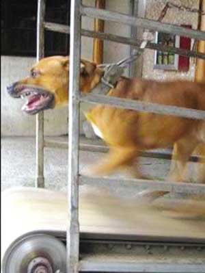 跑步機(jī)上的狗口吐白沫讓人不忍卒看