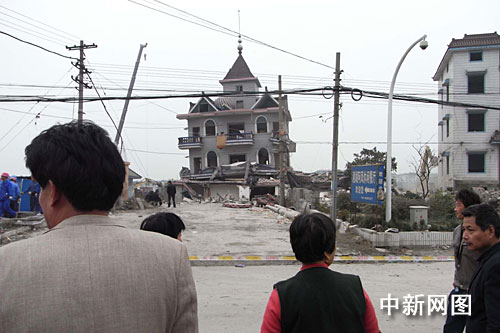 戶主王興福(左一)看著自己的房子被拆除。作 者:姜越潮