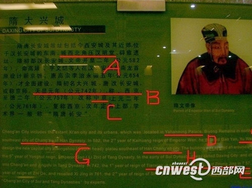 在介紹到隋朝歷史時,展板上的文字說明寫到:“Daxing City of the Sui Dynasty”(公元581-681)……”,且不論翻譯是否正確,這隋朝的滅亡時間怎么就從公元618年推遲到公元681年了?生生是讓隋朝遲亡了63年,而這時,唐太宗李世民(公元598~649)都已經(jīng)死了。在另一處說明中這樣寫道:“天顯元年(公元742年)……”,其一,“天顯”年號跟隋唐根本沒有任何關(guān)系,而應(yīng)該是遼太祖耶律阿保機(jī)的年號;其二,742年應(yīng)該是“天寶元年”。