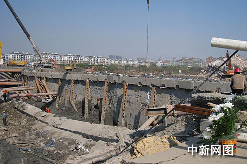 今天下午,記者看到有兩名三十出頭的年輕人手捧白色菊花來到地鐵坍塌現(xiàn)場,表情十分沉重。兩人走到基坑南側(cè),在一塊空地上放下菊花,隨后環(huán)視周圍,流露出幾分焦慮。雪白的菊花因幾許微風(fēng)拂過而輕輕顫抖,似乎也在訴說著遇難者的不幸。