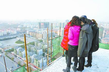 昨日下午3時,記者趕到航海路與未來路交叉口附近的中鼎翡翠2期公園壹號樓盤。記者上到25層樓頂,看到6名女子正站在西側(cè)沒有任何防護設(shè)施的邊緣。聞訊趕到的管城消防大隊一中隊消防員和航海路派出所民警已經(jīng)趕到現(xiàn)場,對欲跳樓的6名女子進行勸說。由于風大很冷,記者注意到這些售樓小姐相互之間聚得很緊。