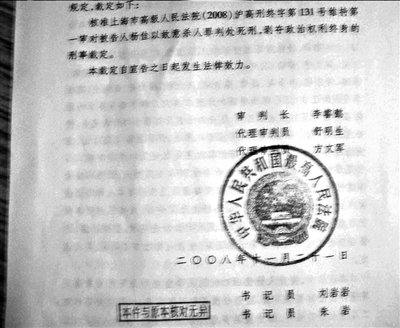 她稱,7點左右,來了兩個上海高級人民法院的法官,向她送達了最高法的刑事裁定書。該文的簽發(fā)日期是11月21日。文中核準了上海市高級人民法院的二審判決。
