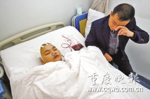 昨中午,記者在大坪醫(yī)院住院部神經外科看見,袁正敏躺在病床上,一根軟管將血液輸進她的頭顱——首次手術取出了頭蓋骨上的鐵叉頭,未將頭蓋骨移植回頭顱;頭頂留有一個乒乓球大小的空洞,全靠醫(yī)療器具護住頭顱,不致被感染。