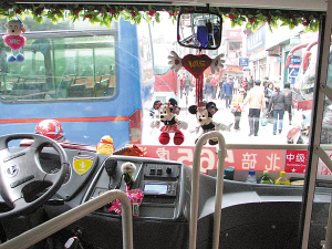 昨天,記者在大學(xué)城看到了這輛動(dòng)漫公交車,車頭的擋風(fēng)玻璃四邊被鑲上了紅花綠葉的塑料花邊,兩只情侶米老鼠固定在了玻璃中央,一只心形的刺繡香包懸掛在了倒視鏡上。法拉利貼紙、悠嘻猴、長(zhǎng)江七號(hào)、superman等玩偶也被安放在車頭不同的位置。