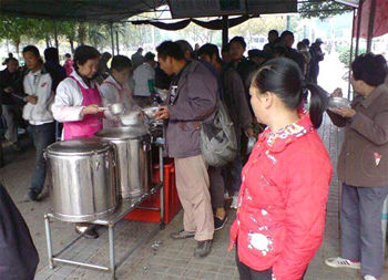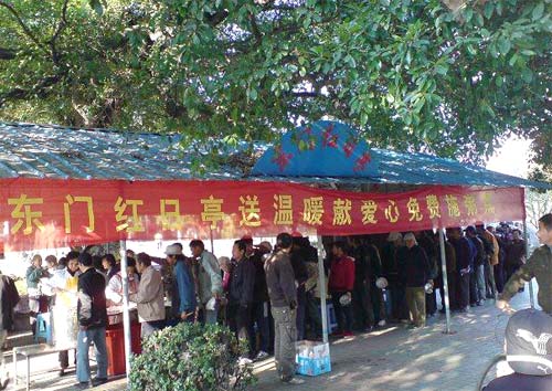 帖子稱:“‘施粥攤’的全名叫‘紅日亭施粥攤’,那里正排著一條長(zhǎng)龍,許多從衣著、年齡和氣質(zhì)上就能看出并不富裕的民眾正安靜地排隊(duì)領(lǐng)受免費(fèi)的大米粥。亭子其實(shí)是一頂帳篷,里面有一些桌椅,可供年老體弱的人坐著吃,更多的人坐在外面。那里正好有幾棵大樹(shù),也成了吃免費(fèi)粥的人休息的地方。每個(gè)領(lǐng)受大米粥的人都可以拿到一副同樣免費(fèi)提供的碗筷,為了衛(wèi)生的考慮,碗用可以盛食物的塑料袋包裹。在亭子的一角,甚至還有免費(fèi)的小菜提供;種類有醬瓜、黃豆、榨菜等等,用一個(gè)個(gè)小碟子盛著,供人自由取用。在那亭子的一側(cè),有一個(gè)‘捐獻(xiàn)名單’,表明是一些有善心的民眾自發(fā)組織起來(lái)的愛(ài)心點(diǎn)……”
