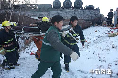 方正縣消防大隊的消防官兵立即趕到現(xiàn)場,使用液壓破拆工具立即對溝中變形的大貨車車體破拆,由于貨車車駕駛室已經被撞癟,駕駛員在什么位置都看不到,這給救援的消防戰(zhàn)士帶來很大困難,消防戰(zhàn)士從先后從車內狹小的空間救出2人。隨后,交警找來吊車將變形的車體吊起,消防戰(zhàn)士又使用破拆工具將變形的車體破拆開,此時駕駛員已被擠死在變形的車內。