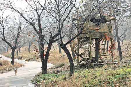 在野狼谷的中心區(qū),記者見到了此次為挑戰(zhàn)者搭建的“鳥巢”,說是房屋,就是一間用鋼管搭建、稻草圍苫而成的距地面3米多高的茅草棚。在野狼谷的3天時間里,挑戰(zhàn)者都要在這個“家”中度過。