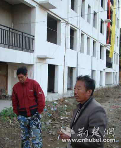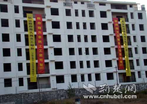 還建樓上懸掛標(biāo)語稱“政府拖欠農(nóng)民工工資”