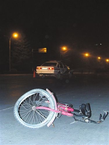 23時45分左右記者趕到事發(fā)現(xiàn)場時,幾名交警正在勘查現(xiàn)場;椟S的路燈下,公路中間躺著遇難者;幾米遠(yuǎn)處,是那輛輪胎已經(jīng)變形的自行車;距自行車10米遠(yuǎn)的地方,停著一輛右側(cè)前燈處有嚴(yán)重“撞傷”痕跡的警用普通桑塔納轎車,警車車牌為“川Z0189警”。