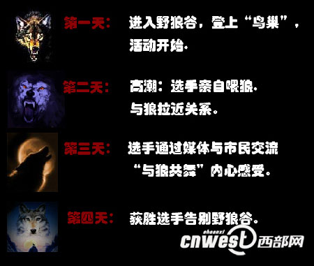 據(jù)西安秦嶺野生動物園負(fù)責(zé)人任飛翔介紹,該園將在陜西省內(nèi)招募三名年齡在二十二歲至四十五歲之間,寫作能力強,善于使用照相機、攝像機,膽量過人且有一定戶外生存經(jīng)驗的男士,于十二月八日進(jìn)入野狼谷指定活動區(qū)域——酷似“鳥巢”的茅草棚居住三天。 期間吃、喝、拉、撒、睡均在“鳥巢”里度過。要求他們記錄下野狼的活動規(guī)律、生活習(xí)性、等級序列、幫派體系,以及狼與狼之間的情愛恩怨,狼與人之間的關(guān)系和挑戰(zhàn)者的感受。按要求完成挑戰(zhàn)任務(wù)者,將獲得五千元人民幣獎金,并頒發(fā)榮譽證書。
