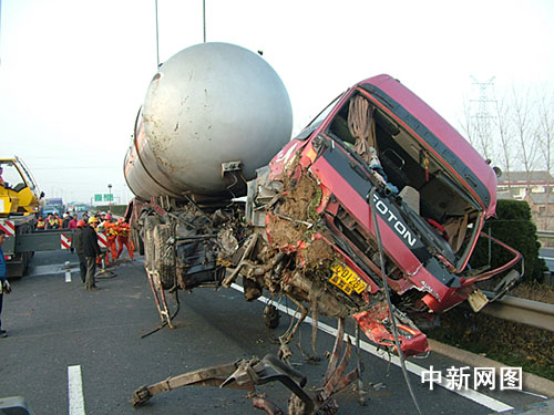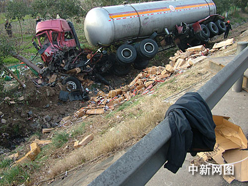 中新網(wǎng)淮安十二月九日電(朱曉穎 閻大偉)七日清晨五時三十分許,京滬高速江蘇淮安楚州段一輛載有一千六百四十箱、萬余把斧頭的大貨車與一輛裝有二十多噸液化氣的槽罐車相撞,由于巨大撞擊力,兩車均沖出護欄、側翻在路邊的溝中,所幸未造成人員傷亡。