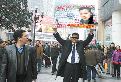 昨天下午4時許,記者在解放碑步行街看到,該男子舉著一塊長1米,寬0.5米的廣告牌在游走,衣著及外形模仿周潤發(fā)在電影《英雄本色》中扮演的“小馬哥”。牌子上大致內(nèi)容是:“中國搖滾領(lǐng)袖舉辦搖滾音樂會,如果你想成名,請收購中國搖滾領(lǐng)袖頭銜,一千萬”。他以這身行頭出現(xiàn)引來上百人圍觀,甚至有市民以為在拍電影,上前與他握手。“他就是上次征千萬富婆的那個人。”部分市民認(rèn)出了這名男子正是幾個月前曾在解放碑征千萬富婆結(jié)婚的“征婚狂人”廣西人毛杰東。毛先生表示,想憑自己酷似發(fā)哥的外形,通過征婚獲得資金發(fā)展搖滾事業(yè),雖沒成功,但他熱愛搖滾的熱情還未減退,這次想在解放碑拍賣自己“搖滾領(lǐng)袖”的頭銜,也就是拍賣自己。如果有人愿意拿出1000萬或500萬來投資,他就可以組辦搖滾演唱會,并將繼續(xù)曾經(jīng)的征婚路線,到各大城市宣傳自己,下一站將到成都。下午6時許,經(jīng)保安人員多次勸解、警告,毛杰東才離開步行街。