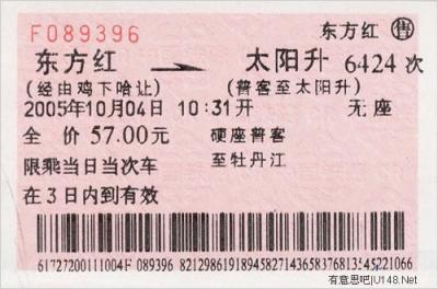 “東方紅”站位于現(xiàn)在虎林市與饒河縣之間的密東鐵路的盡頭站,而車票中顯示的“太陽(yáng)升”站,是位于黑龍江省大慶市大同區(qū)太陽(yáng)升鎮(zhèn)的“太陽(yáng)升”火車站。這張2005年的車票顯示,由“東方紅”至“太陽(yáng)升”需要經(jīng)過(guò)多次轉(zhuǎn)車,而售出這張車票的是“東方紅”火車站。水妖昨日打電話詢問(wèn)該站工作人員得知,票上的“雞下哈讓”分別代表4個(gè)中轉(zhuǎn)地:雞西、下城子、哈爾濱、讓湖路。這樣的車票現(xiàn)在還可以買到,不過(guò)當(dāng)年的車次已經(jīng)改變,現(xiàn)在這條路線的車次應(yīng)該是6224次。