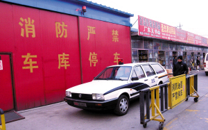 ?吭诔枛|郊市場內(nèi)消防車庫門前的“山寨警車”。晨報記者 蔡代征/攝