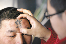文在哪呢?他想也沒想,指向了腦門。過了30分鐘,一個鏤空的、深藍(lán)色的“窮”字就出現(xiàn)他的腦門上了,這個字花了他30元錢。