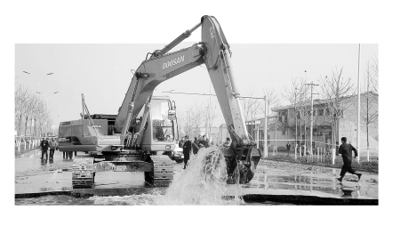 昨天下午14時當(dāng)記者趕到爆管現(xiàn)場時看到,爆管口還在不斷地向外噴水,爆管處的水泥馬路被強大的水壓徹底掀翻,大水涌向馬路南邊的育才學(xué)院和一家汽車專賣店。緊急之下,育才學(xué)院發(fā)動師生搶險,用沙袋封堵了學(xué)校大門口。汽車專賣店來不急關(guān)門,半米高的大水柱涌進店門將陳列的5輛汽車下半段浸泡,大水同時還涌進一家公司庫房。據(jù)現(xiàn)場目擊者介紹,當(dāng)時轟隆一聲巨響,現(xiàn)場馬路中間裂開一個大口子,隨之向南育才學(xué)院方向傾斜著沖出7米左右高的水柱。由于水量很大,附近下水道不能及時排水,大水綿延到附近村莊!