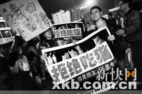 在廣場上,一見“聞貓即興”等人出來了,其他人都著急地圍上去詢問。盡管結(jié)果不是太讓人滿意,但大伙還是決定在廣場上舉行一次小型的抗議活動(dòng)。100多人圍在一起,高舉著“請(qǐng)發(fā)揚(yáng)人道主義,放過它們”、“請(qǐng)口下留情”、“拒吃貓肉”等紙牌,喊著口號(hào)。并有細(xì)心的網(wǎng)友拿著印制好的傳單,向候車的乘客宣傳“不吃貓肉”。對(duì)此,路人大都報(bào)以一笑。