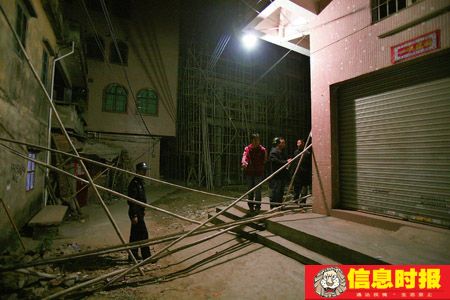 昨晚7時,記者來到向西村時,西約新屋一帶仍處于封鎖狀態(tài),警戒線內停水停電,任何一個可以通往地陷現(xiàn)場的巷口都由專人看守。救護車、消防車現(xiàn)場待命,陸續(xù)有大型混凝土運輸車進入村內。