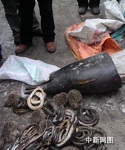 中新網(wǎng)吉林1月3日電(蒼雁)近千條野生錦蛇,一只海豚頭和刺猬在吉林市場(chǎng)被叫賣,1月3日,吉林市林業(yè)局稽查支隊(duì)查獲了這些在冬天里被捕殺的珍貴野生動(dòng)物。