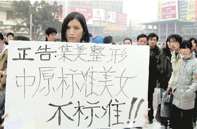 “人為地給美女定下標(biāo)準(zhǔn),是對(duì)中原女性的不尊重!弊蛉障挛纾咚,一名身材高挑、披肩長(zhǎng)發(fā)、顴骨高凸、細(xì)看還有喉結(jié)貌似女人的男子舉著一塊牌子,牌子上寫著:正告集美整形,中原標(biāo)準(zhǔn)美女不標(biāo)準(zhǔn)!這名男子不時(shí)用雙手將牌子舉過頭頂,引得周圍的人們指指點(diǎn)點(diǎn)。