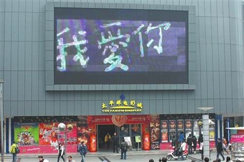 昨日(1月8日)下午3點(diǎn),人來人往的成都青年路某影院前,一只胖乎乎的“小熊”正在向人群散發(fā)宣傳單。而影院上方的電子屏幕卻突然插播起一條尋人啟事,請現(xiàn)場一位叫“李嬌”的女孩趕緊朝屏幕招招手!斑@是在做什么?”行人紛紛好奇地停下腳步,一名長發(fā)女孩茫然地伸出手揮了揮之后,明星謝娜竟也出現(xiàn)在了屏幕上:“名叫李嬌的女娃娃,你好。你的男朋友讓我告訴你,他很愛你,想一輩子照顧你,永遠(yuǎn)和你在一起!迸⑽孀∽彀,似乎不敢相信眼前的這一幕。緊接著,一旁的“小熊”給她獻(xiàn)上了一束玫瑰,突然脫下頭罩,和她擁抱在了一起。原來,這是一場街頭上演的愛情告白。
