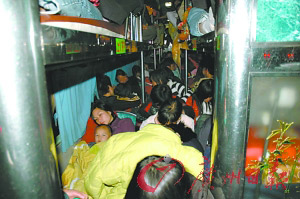 公路客運高峰昨日殺到,記者從省公安廳交通管理局獲悉,春運總體形勢平穩(wěn),但春運道路安全形勢不容樂觀,省內(nèi)交警部門在路面執(zhí)勤中連續(xù)查處嚴(yán)重超載行為,最離譜的客車核載39人,竟塞進(jìn)了101人。而且還出現(xiàn)了超載客車相互串通、聯(lián)合闖關(guān)等情況,甚至有些無良司機(jī)為躲避檢查,在經(jīng)過檢查點時將乘客塞入行李廂。省交管局重申,超載行為是今年春運交通檢查的重點,除了對車上乘客進(jìn)行檢查,客車行李廂也是檢查重點。