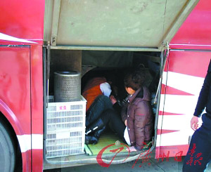 1月13日上午11時,東莞麻涌春運執(zhí)勤點執(zhí)勤民警對一輛號牌為湘F06266的客車進(jìn)行例行檢查發(fā)現(xiàn),該車的行李廂有異樣,打開一看行李廂中竟藏了一個大活人。客車司機(jī)卻表示不知道這個人何時上車。經(jīng)過對司機(jī)和藏匿乘客的訊問,司機(jī)王某某終于承認(rèn)自己為賺取路費甘愿冒險。