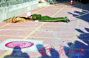 據(jù)現(xiàn)場消防官兵介紹,下陷的大坑有七八米深,因為事發(fā)地段為填海而成,加上旁邊有施工工地,泥沙流失可能是其下陷原因,擔(dān)心路面出現(xiàn)更大面積下陷,消防救援官兵所開來的專業(yè)吊車一時不敢靠近洞口。