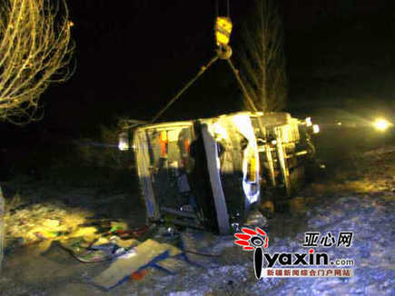 1月17日凌晨3時(shí)許,在大雪中,一輛載有35名乘客的大客車從塔城和豐縣開往烏魯木齊時(shí),途經(jīng)312國道4251公里處(呼圖壁縣境內(nèi))時(shí)與一輛大貨車迎面相撞,致使大客車側(cè)翻路基下,3人死亡,25人受傷。該事故還致使另外4輛車發(fā)生連環(huán)相撞。