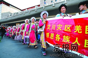 在排練基地,有26名穿著羌族服裝的演員非常引人注目,他們都是來自汶川、茂縣等地震重災(zāi)區(qū)的村民,昨天中午1時剛剛抵達(dá)北京。