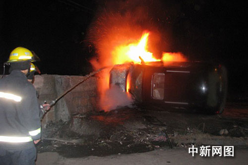 中新網(wǎng)瑞安1月24日電(記者袁爽 通訊員余根鈴)24日凌晨,在浙江瑞安市經(jīng)濟(jì)開發(fā)區(qū)濱江大道與東港路交叉口處發(fā)生了驚險(xiǎn)的一幕。一個(gè)急轉(zhuǎn)彎,一輛北京現(xiàn)代越野車失控,撞上圍墻側(cè)翻并冒出滾滾濃煙,隨后冒出火苗,車子系統(tǒng)失靈,車門打不開,從天窗上爬出3男1女,攔下出租車,往醫(yī)院趕去。