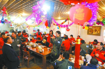 吃得高興的老外紛紛向中國同行們拜年,生硬的中國話“中國新年好”,在食堂里此起彼伏。