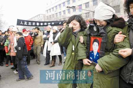 在前往遺體告別儀式舉行地——中牟縣殯儀館時(shí),不足5公里的路段,送行的隊(duì)伍被4次攔住,行走了一個(gè)多小時(shí)。途中不少負(fù)責(zé)執(zhí)勤的交警,一只手在敬禮,而另外一只手則悄悄在抹眼淚。
