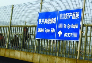 時(shí)先生所指的指路牌有四塊。其中一塊懸掛在新發(fā)地長(zhǎng)途客運(yùn)站門(mén)前的過(guò)街天橋南側(cè)護(hù)欄上,正下方為進(jìn)京方向輔路。這塊藍(lán)底白字的牌子上,并排印著京開(kāi)高速輔路和某家婦產(chǎn)醫(yī)院的字樣,旁邊還有相應(yīng)的英文和箭頭指明方向,并留有醫(yī)院電話。