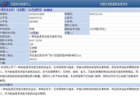 隨后,信息時報記者登上了中國專利信息中心這個國家知識產(chǎn)權(quán)局直屬單位的網(wǎng)站,根據(jù)網(wǎng)友“呂輕侯”提供的截圖和信息,在中國專利信息中心的專利數(shù)據(jù)庫檢索系統(tǒng)仲搜到了這份申請(專利)號為200510012992.0的申請公開說明書。申請(專利權(quán))人和發(fā)明人是一個家住河北省石家莊市,名叫王俊峰的人。提出申請的日期是2005年的11月21日,而該發(fā)明的全稱為“一個檢驗是否貪官污吏的方法”。