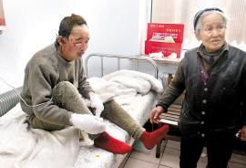 昨日,記者來(lái)到長(zhǎng)春燒傷醫(yī)院,見(jiàn)到了母子兩人。42歲的崔某頭部、面部、雙手等處被燒傷,雙手纏著厚厚的紗布。崔某83歲的母親一直在病房?jī)?nèi)照顧兒子。