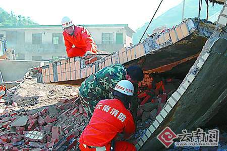 據(jù)介紹,當日12時12分,羅平消防大隊接到縣指揮中心指令稱:阿魯鄉(xiāng)樂戈必小學的一所兩層樓的危房倒塌,兩名群眾被埋,生死不明,情況十分緊急,請求救助。消防大隊立即成立救援指揮部,下設(shè)偵查、警戒、保障、戰(zhàn)斗等4個救援小組,迅速出動1車5名消防官兵火速趕赴事故現(xiàn)場。