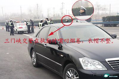 在帖子中,“一鍵盤敲死你”稱,開車經過三門峽時被交警攔下,由于他車牌上的一顆螺絲釘遺失,交警為此罰款2000元,還沒有給任何收據。無奈之下自己稱沒錢,交警便沒收了他的車載GPS等車載電器。他還稱,交警隊員曾對他口吐污言穢語,并且交警衣帽不整、酒氣熏天。在網友用手機拍下的照片中可以看到,有一位交警嘴里叼著香煙,另有一位交警沒戴帽子在與司機交談。