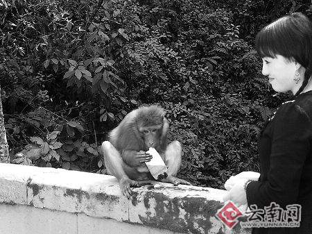 當(dāng)時(shí),兩只猴子正一前一后站在公路旁的擋墻上,一邊來回走動(dòng)啃食游客“進(jìn)貢”的食品,一邊不斷發(fā)出“;!钡暮鸾新暎路鹗窃趯(duì)圍觀的游人說:“快進(jìn)貢些好吃的來,不然休想打此經(jīng)過!倍慌砸延袛(shù)輛路經(jīng)此地的車停靠在路邊,10余名游客正興致勃勃地圍著兩只猴子觀看,幾名膽大的游客正在接受猴子的命令,乖乖地向猴子奉上隨車攜帶的食品,以供他們享用。