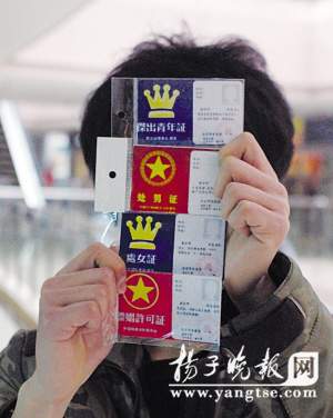 昨天,記者在常州南大街商業(yè)步行街的一家商鋪里看到,一些彩色的塑料卡片竟然印上了“嫖娼許可證”、“處男證”等刺眼字樣。記者看到,在一張“嫖娼許可證”的左半部分紅底黃字,不僅寫(xiě)有“嫖娼許可證”的字樣,還煞有介事地印上了“網(wǎng)絡(luò)奸淫委員會(huì)”字樣;右側(cè)為白底黑字,姓名、年齡、性別等一應(yīng)俱全。采訪中不少市民表示,這樣的惡搞卡片實(shí)在有些低級(jí)趣味,很容易對(duì)小學(xué)生以及青年人產(chǎn)生不好的影響。