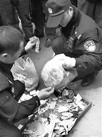 上午10時40分,警方將老人從樓上扔下的錢、名片、光盤等東西一一收拾好帶走,以作進(jìn)一步調(diào)查。