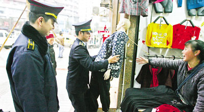 記者在沙坪壩區(qū)天陳路看到,臨街的公苑旅館在窗外懸掛被單,3名城管隊員連忙趕去,幫助店主收拾被單,臨走時丟下一句溫馨提醒“請記住,以后不要隨意懸掛物品”,整個過程只用了5分鐘,并未開罰單,店主十分滿意。10:10,記者看到,石碾盤一家服裝店剛購進2個模特兒,女店主一人無法搬移,2 名城管隊員連忙上去幫忙。10:20,天陳路一個“傳統(tǒng)包”店前,2名城管隊員正熱情幫助店主搬蒸鍋。旁邊的“泰國香米蛋糕”店門前,也有城管隊員在幫忙。