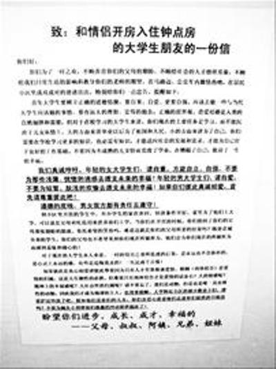 原公開信就貼在南京仙林大學(xué)城文苑路某高檔小區(qū)門口,信中告誡大學(xué)生不要“為了一時之歡,不顧養(yǎng)你們的親人的期盼,不顧給社會人才的榜樣形象,不顧給我們?nèi)粘I畹挠绊懀诰用裥^(qū)內(nèi)成雙成對地進(jìn)出……”公開信還提醒提供日租房的小區(qū)業(yè)主“不要為蠅頭小利替他們愚蠢的沖動提供溫床了!”信件的落款是“盼望你們進(jìn)步、成長、成才、幸福的父母、叔叔、阿姨、兄弟、姐妹。”