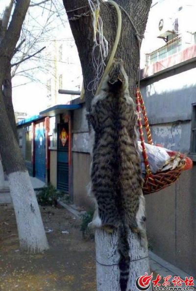 網(wǎng)友原帖這樣寫道:“最近回家休假,發(fā)現(xiàn)小區(qū)里的流浪貓少了很多。聽樓下的大媽們說是被人用獵狗殺死,貓肉吃掉,貓皮賣掉,開始我總覺得有點危言聳聽,因為聽說過那家人養(yǎng)狗,好像還是退休教師,總不至于那么殘忍吧,可今天中午無意中從那家人門前經(jīng)過,發(fā)現(xiàn)門前的兩棵樹上赫然釘著兩張貓皮,問了一下旁邊經(jīng)過的小學(xué)生,他們說隔幾天就會有新的貓皮被釘上,聽了后我直接無語。希望那些死去的流浪貓在天堂一路走好!