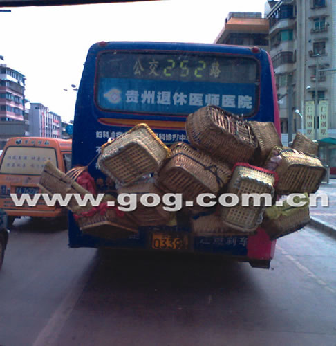 近日,有網(wǎng)友在貴陽(yáng)論壇上稱,252路公交車是“貴陽(yáng)最牛公交車”,因車頭車尾都掛著籮筐。