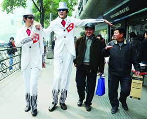 提起這兩個(gè)小伙子,南京市民可能并不陌生。2米26的那個(gè)叫張夢(mèng)永,2米12的叫秦為超,快報(bào)曾經(jīng)報(bào)道過(guò)他倆的“雙塔組合”。昨天下午兩點(diǎn),兩“巨人”出現(xiàn)在山西路上,穿著定制的白色禮服,戴著高高的白色禮帽,再配上酷酷的墨鏡,所經(jīng)之處立刻被圍得水泄不通!巴,你有姚明高么?”“你們的腿是真的假的?”“這么大腳,是真的么?”圍觀的市民們提出千奇百怪的問(wèn)題,兩個(gè)小伙子耐心地一一解答。