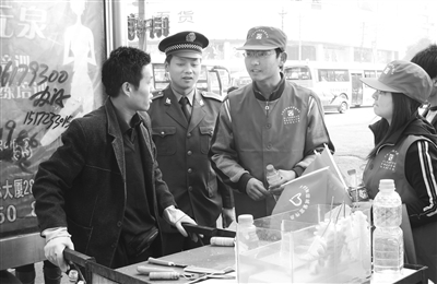 昨日首次“上崗”2小時,這群大學生“城管”共勸阻占道經(jīng)營、流動攤販17處,清除“三亂”牛皮癬34處。(記者 夏瓊 通訊員 葉火生 李梅)(記者 蔡曉智 通訊員 李梅 攝)
