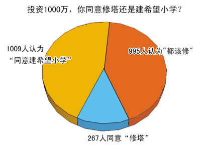 截至昨天下午5時,大渝網(wǎng)發(fā)起的調(diào)查顯示,你認為修建第一高塔有必要嗎?2475人參與投票,1154位網(wǎng)友認為“沒必要,又是面子工程”;1091人認為“為了導(dǎo)航,也能增添新景觀”。在“投資1000萬,你同意修塔還是建希望小學(xué)?”的調(diào)查中,網(wǎng)上2271人參與投票,1009人認為“同意建希望小學(xué)”;267人同意“修塔”。